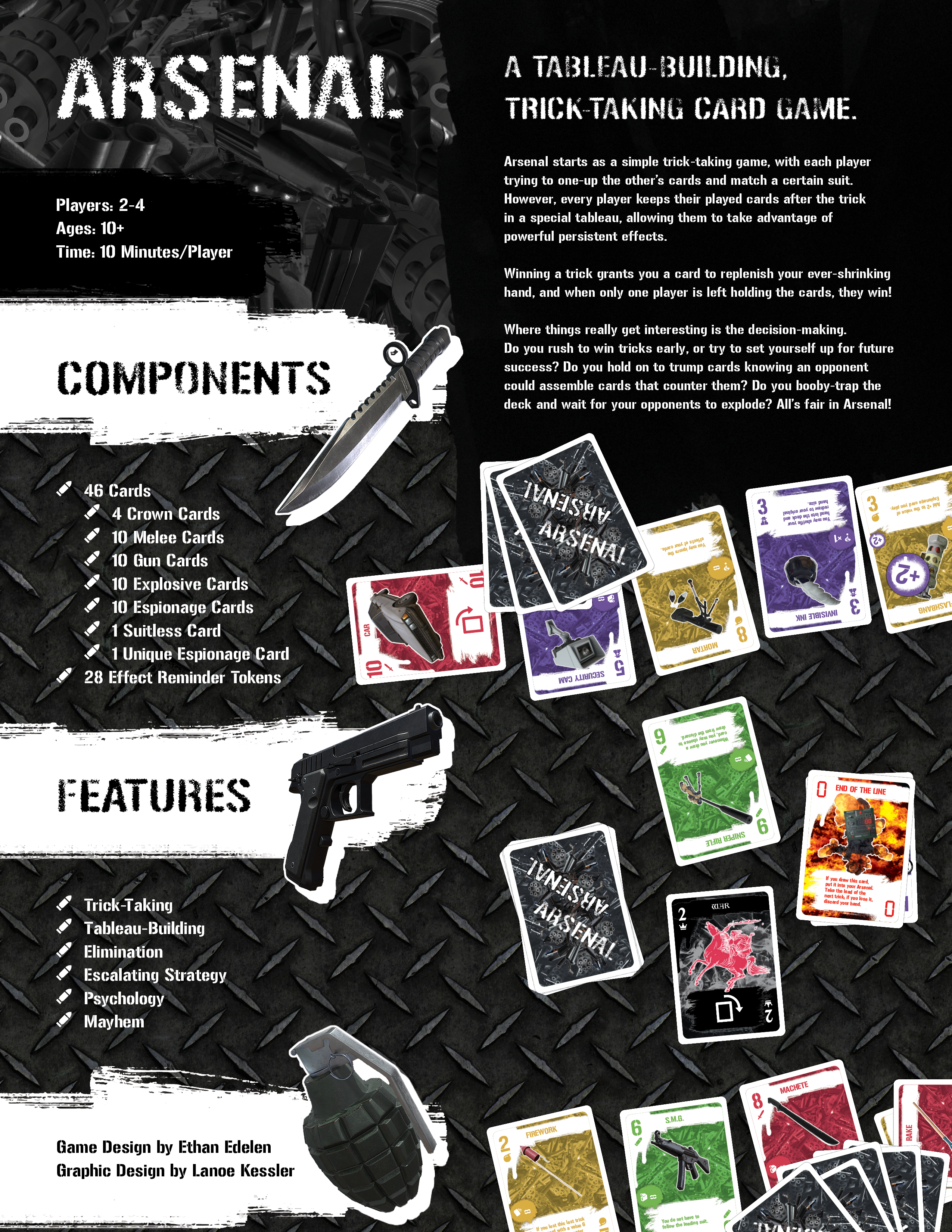 A tableau-building, trick-taking card game designed by Ethan Edelen, comprising 46 cards and 28 tokens.