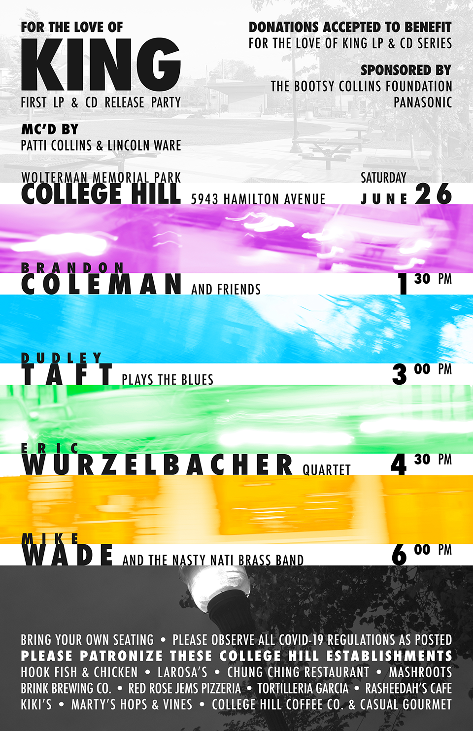 Print poster design for an event at Patrick Wolterman Park in support of FOR THE LOVE OF KING, featuring performances by Brandon Coleman & Friends, Dudley Taft, the Eric Wurzelbacher Quartet and Mike Wade & the Nasty Nati Brass Band.